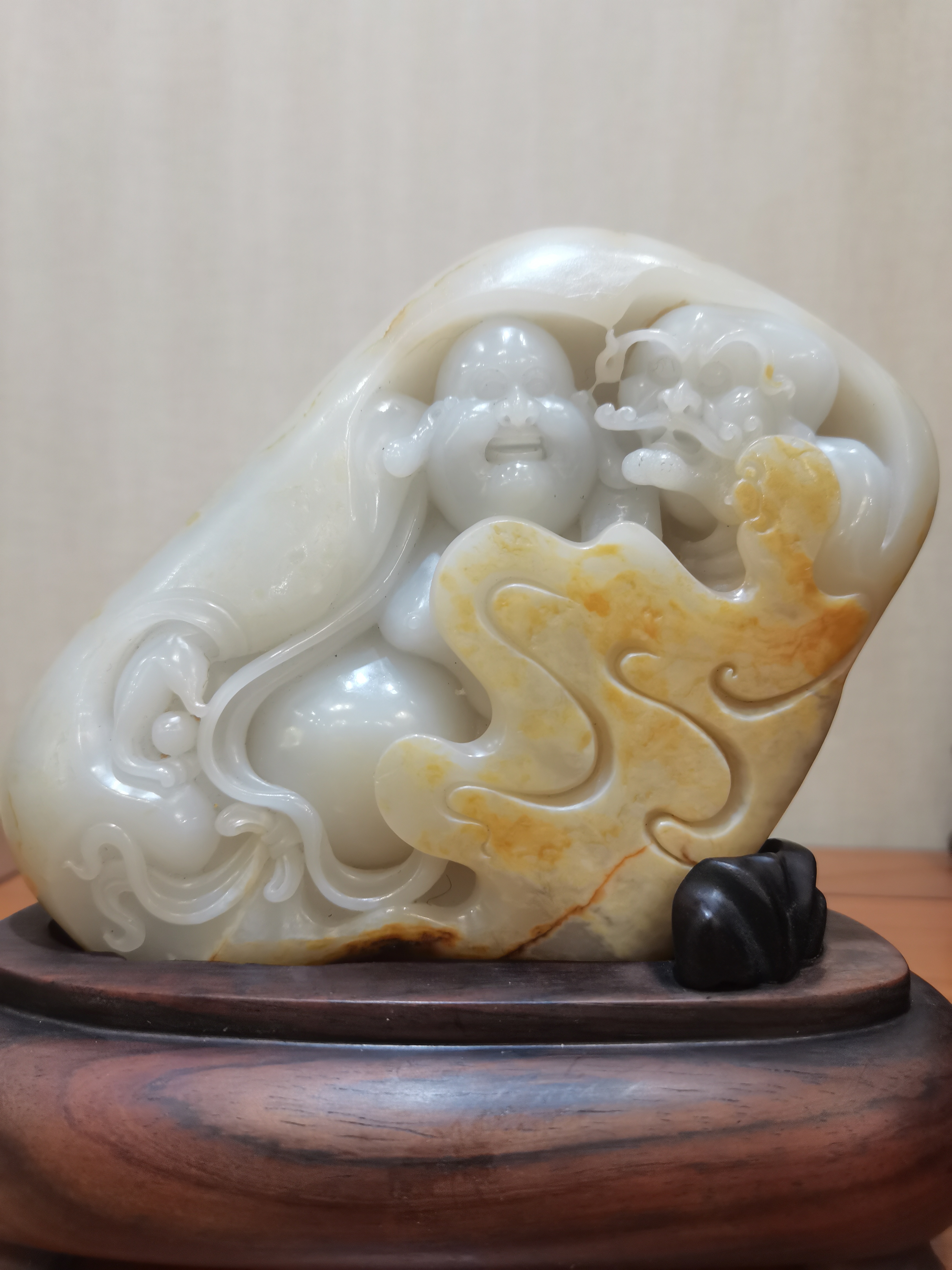 稀有的大塊獨籽雕刻,器型飽滿大氣,非常老熟的玉種,彌勒佛手持寶珠,衣袂飄飄。右邊雕刻羅漢,形象逼真。布局疏朗、層次分明,動感強烈,細節(jié)處理非常精細,曲線流暢自然,如行云流水。兩位仙人同時護佑康寧,乃洞天福地。