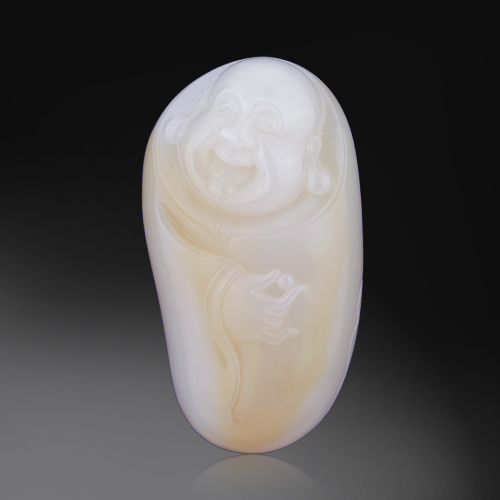 編號:RY30-301 作品整體造型完整大氣,精心雕琢一位笑意迷人的彌勒佛,笑佛開臉細致生動,光頭禿頂,彎眉笑眼,長耳垂肩,鼻頭高挺,玉佛笑意盈盈,和藹可親,手中托著一顆晶瑩的佛珠,淡淡的糖色遍布全身,更顯吉慶喜人!