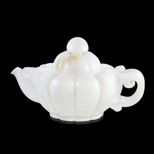 通體雪白無暇、晶瑩飽滿、細膩滋潤如羊脂,壺蓋、壺嘴有天然糖色。執壺形,壺身雕刻做南瓜,與壺流相接處鏤雕云紋如意,有壽比南山、福運綿長之吉祥寓意。揚州工力作,玲瓏精巧、秀麗典雅。