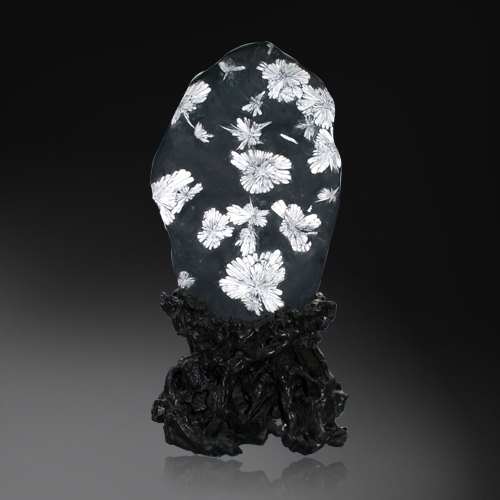 天然菊花石是瀏陽河天青石中含凸鏡狀灰?guī)r,經(jīng)數(shù)億年地質(zhì)變化,演變而成。乳白色天然花形,酷似盛開的朵朵菊花,紋理清晰,界線分明,質(zhì)地堅實,花形千姿百態(tài),蔚為奇觀,潔白美麗的花瓣是由天然的天青石和方解石組成。中華人民共和國地質(zhì)礦產(chǎn)部將其列入寶石類,并命名“玉疊妃”。因其蘊量稀少,比珠玉寶石類更珍貴。故又被稱為“全球第一”。 菊花石的發(fā)掘,雕刻成工藝品,則始于清乾隆年間,當(dāng)時只作宮庭貢品,后才在民間流傳。一九一五年巴拿馬萬國博覽會上,菊花石雕“梅、蘭、竹、菊”橫屏參展,榮獲金獎,震驚世界,驚嘆“石頭能開花”,從此享譽全球。