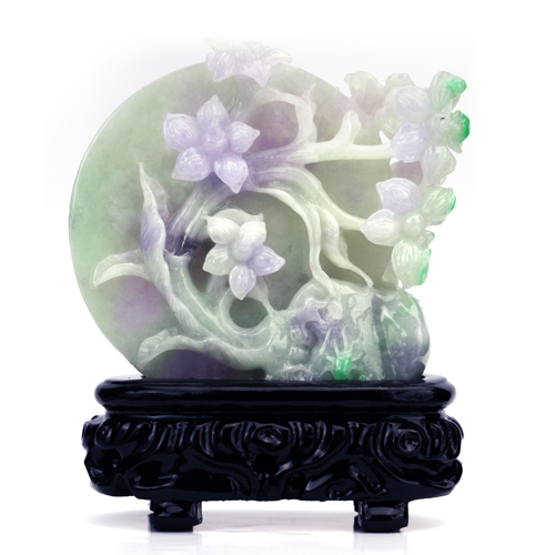 運用高浮雕與立體雕結(jié)合的雕琢技法,巧妙地運用原料的皮色,色澤過渡自然,玉石中飄綠而透著紫氣,同樣是姿彩綺麗、明艷動人,意境美與色彩美油然而升!